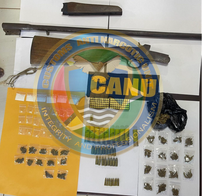 • Subsequent investigations led to the search of a premises in Achiwib Village, where officers discovered a quantity of suspected cannabis. Further search of a shop located on the same premises resulted in the discovery of a quantity of ammunition, a firearm and several small transparent zip-lock bags containing suspected cannabis and a whitish, rock-like and powered substance suspected to be cocaine.